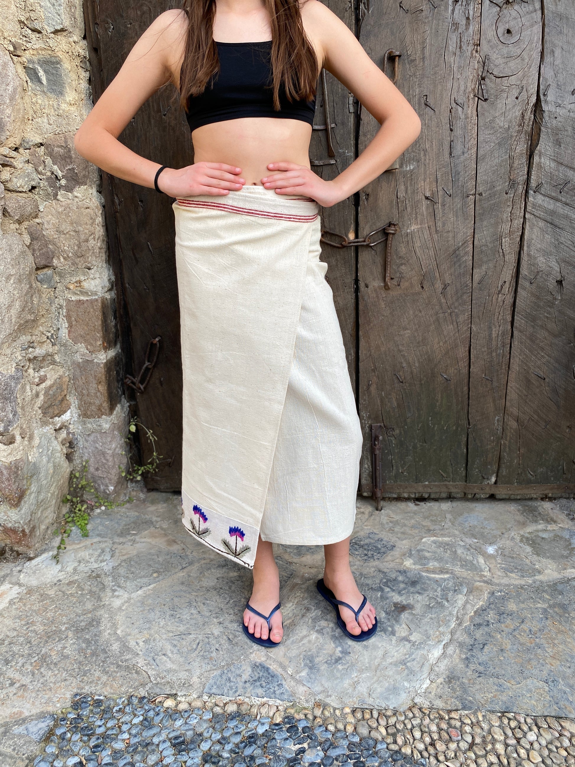 Tezgah dokuma vintage ketenden dikilmiştir. Anvelop şeklindedir, belinde ayar için iliği vardır.